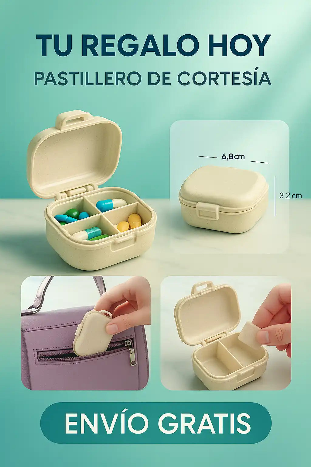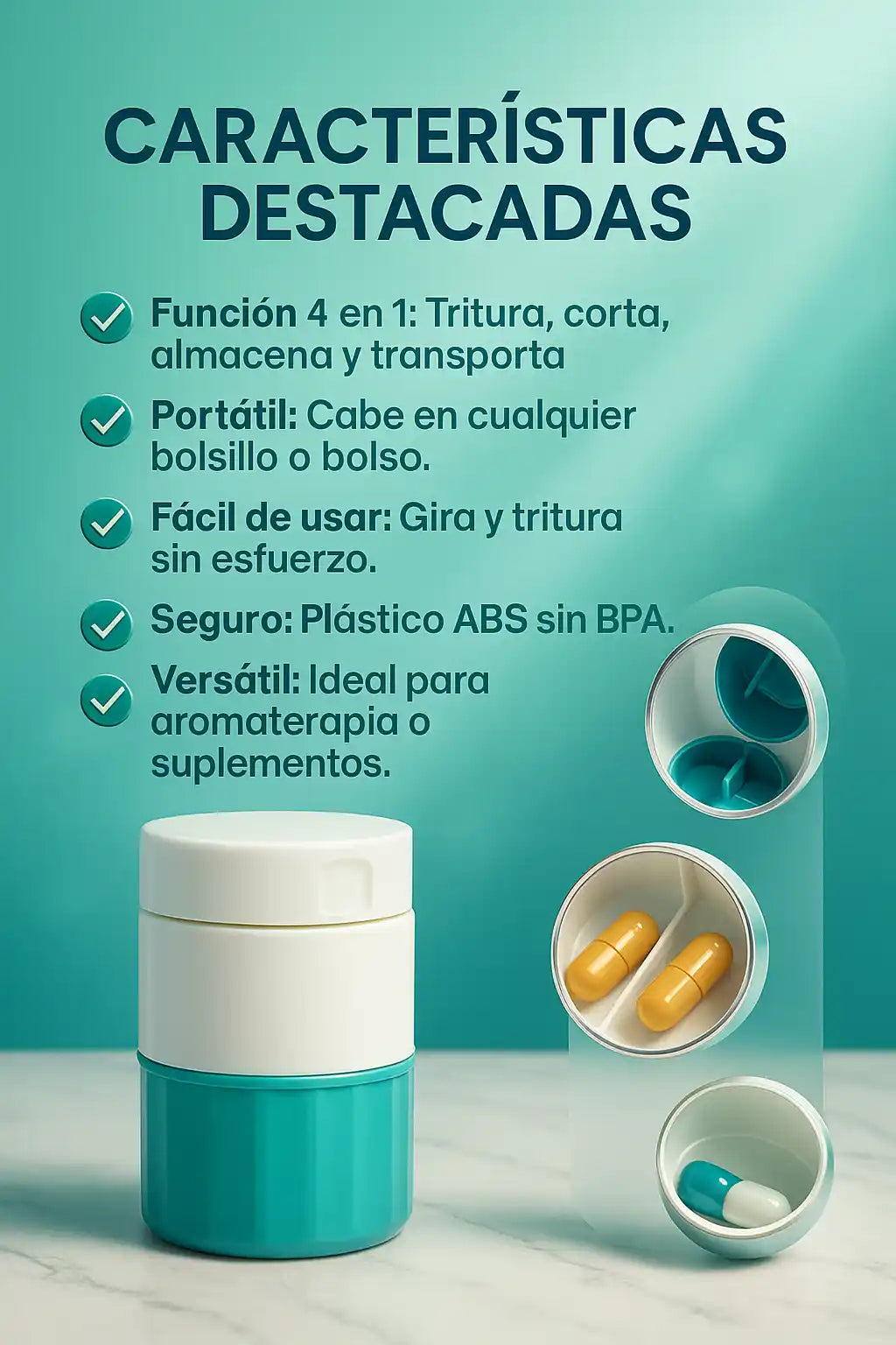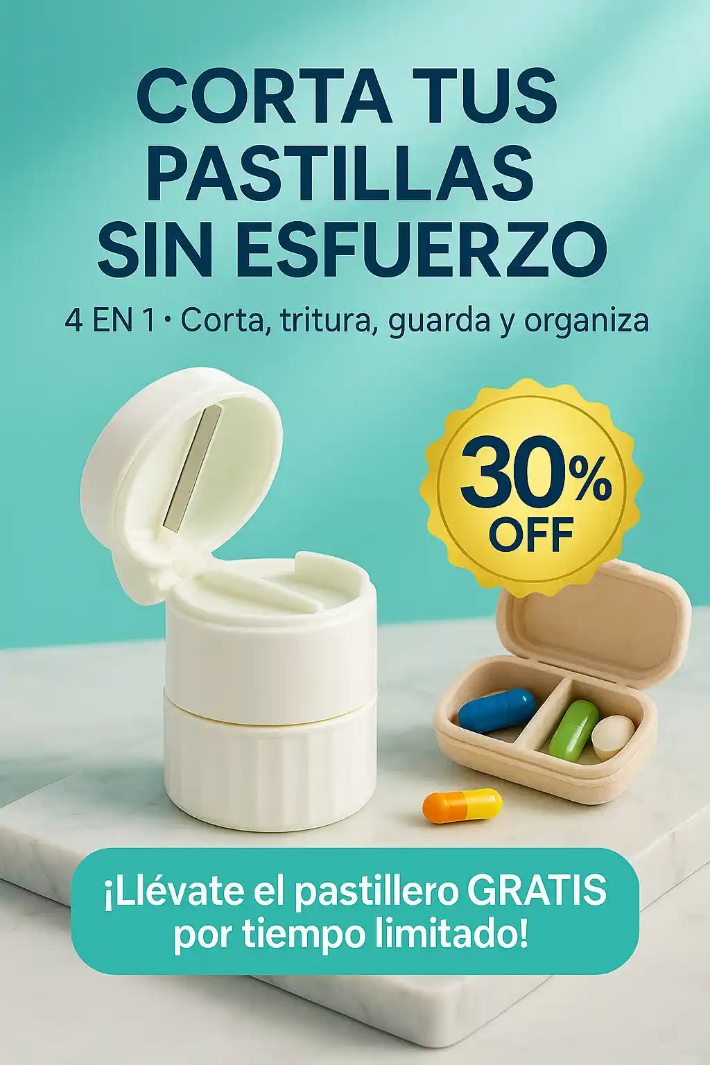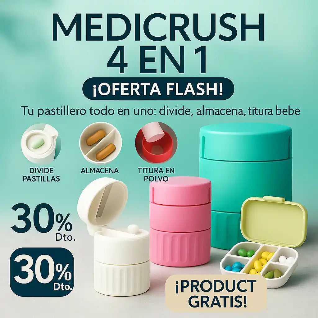 Recibes el vaso triturador 4 en 1 con función de triturar, almacenar, mezclar y beber. Además, si compras hoy, te regalamos el pastillero semanal totalmente GRATIS.